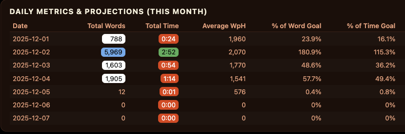 I am very happy with my program-based Writing Log. It reduces the friction to write by quite a bit, and when I’m not trying to get warm or have other external factors affecting my interest in writing, I have found that not worrying about recording sessions in a spreadsheet makes it far easier to write.